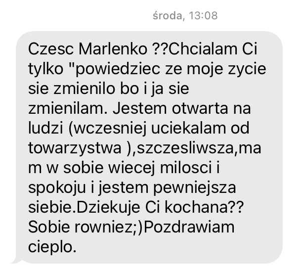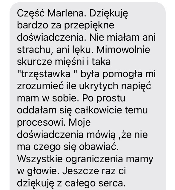 ”Z każdą kolejną sesją dziękuję coraz bardziej za to że wszechświat dał mi Ciebie z tą metodą. Nie da się opisać słowami tego co mi towarzyszy podczas aktywacji, ale wiem i czuję że każde kolejne spotkanie jest pełniejsze, coraz bardziej uwalniające i owocne. A to co się wydarza po sesji powinien doświadczyć każdy w życiu, to jak otwarcie sekretnych drzwi do życia w pełni! Powoli pokazują się możliwości, łamią schematy i rozszerza się perspektywa. Dziękuję, dziękuję i jeszcze raz dziękuję!”