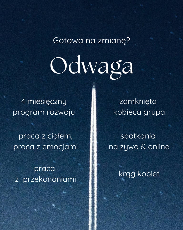 "Odwaga" to program rozwojowy dla kobiet, który jest ewolucją mojej pracy w grupowych cyklach. Tym razem zebrałam najcenniejsze narzędzia, które wykorzystuję w sesjach indywidualnych, pracy z grupami i swoim własnym procesie rozwoju, aby ułatwić Ci dokonać realnych zmian w swoim życiu i zbliżyć się do najlepszej, dostępnej wersji Siebie.