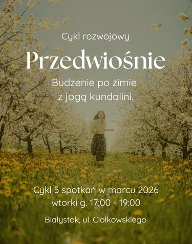 Zapraszam Cię do nowego cyklu rozwojowego „Przedwiośnie. Budzenie po zimie z jogą kundalini”. To cykl 5 spotkań, które pomogą Ci przebudzić się do życia po długiej, mroźnej zimie, podnieść energię i poczuć się lepiej - fizycznie, energetycznie, emocjonalnie.