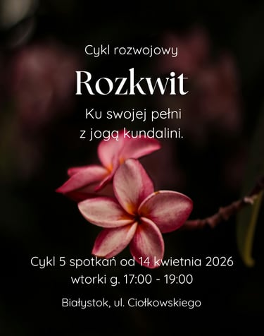 Zapraszam Cię do nowego cyklu rozwojowego „Rozkwit. Ku swojej pełni z jogą kundalini”. To cykl 5 spotkań, które pomogą Ci przebudzić się do życia po długiej, mroźnej zimie, podnieść energię i poczuć się lepiej - fizycznie, energetycznie, emocjonalnie.