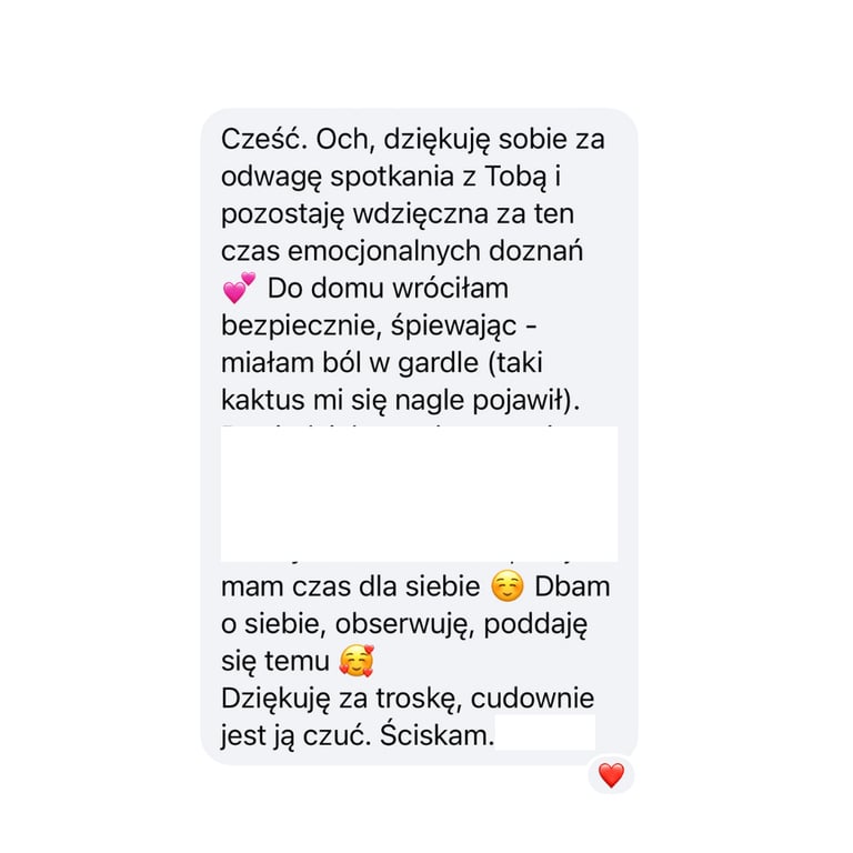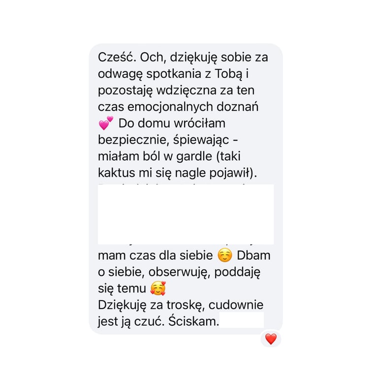 Każde spotkanie jest inne. Zależy od osoby, dotychczasowych doświadczeń, otwartości na pracę w podobnych metodach. Z mojego doświadczenia wynika, że niektóre sesje w dużej mierze odbywają się w oparciu o pracę somatyczną, a inne o pracę z energią. Nie ma to znaczenia dla skuteczności procesu. Każda historia potrzebuje indywidualnego podejścia.